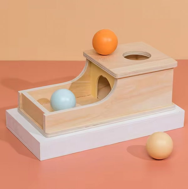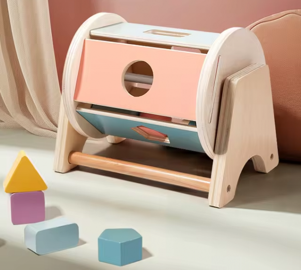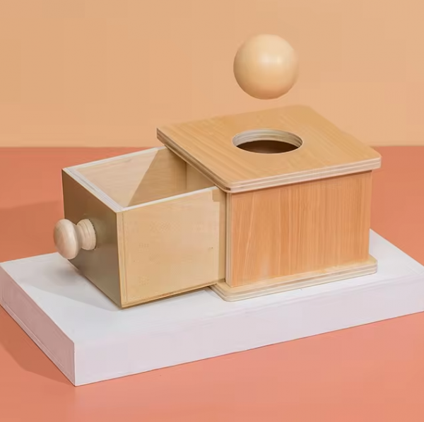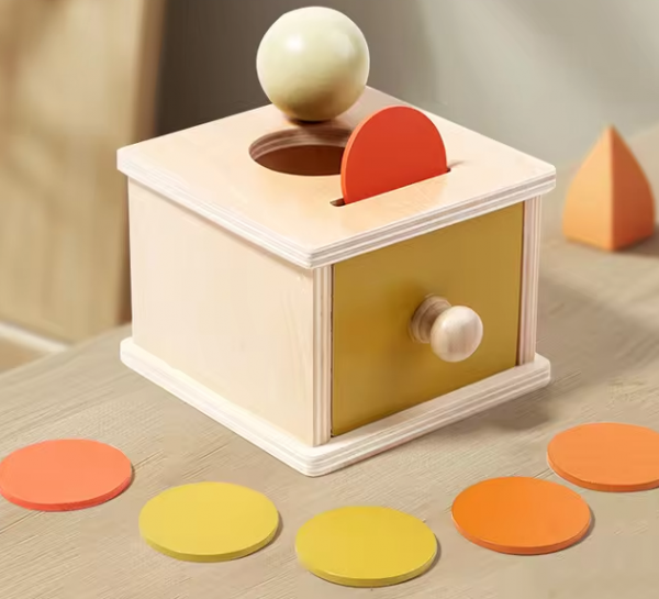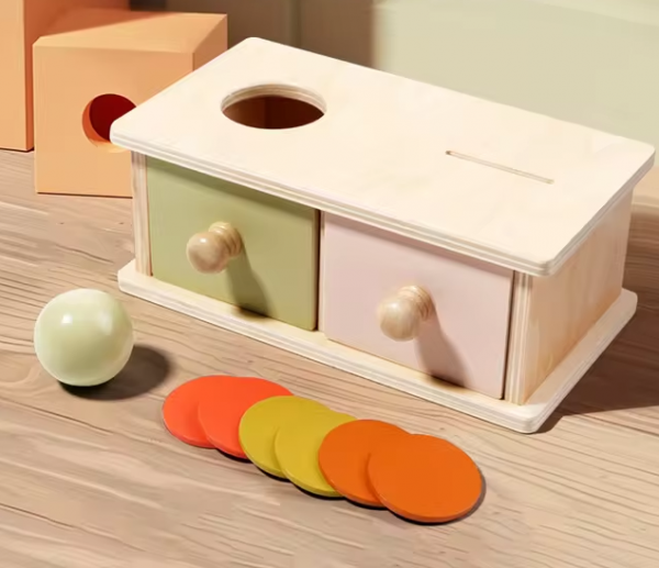Montessori Holzspielzeug für Babys – fördert sensorische und logische Fähigkeiten durch Münzschublade und Trommel. Perfekt für die frühe Bildung.